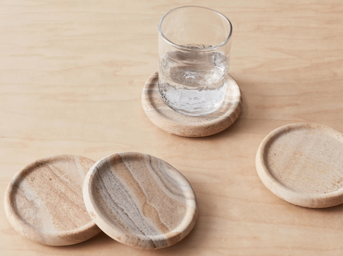 The Citizenry Eshana Sandstone Coasters Made in the Dehtora Stone Workshop in Agra, India, these stunning handcrafted sandstone coasters exude simple sophistication while protecting your surfaces from stains and damage. With their muted hues of swirling red, brown, and violet, they're as pretty as they are practical. – Natalie Stone, Managing Editor