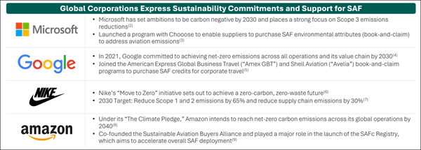 A growing number of global corporations have publicly committed to reducing carbon emissions, with several specifically supporting the adoption of Sustainable Aviation Fuel (SAF) as part of those efforts. |