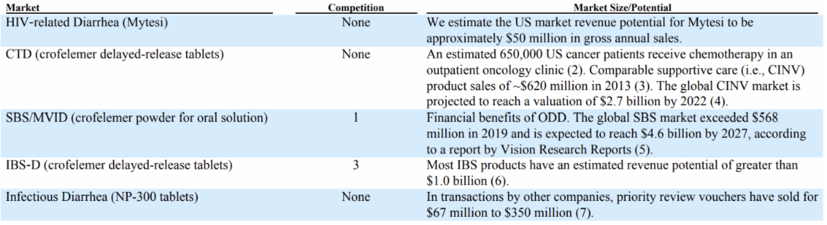 The Company believes the medical need for Mytesi is significant, compelling, and unmet, and that doctors are looking for a drug product with a mechanism of action that is distinct from the options currently available to resolve diarrhea.