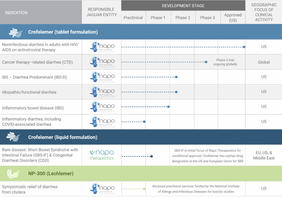 Jaguar family companies Napo and Napo Therapeutics, S.p.A., an Italian corporation Jaguar established in Milan, Italy in 2021, are focused on expanding global crofelemer access and are developing new therapies for orphan and rare GI conditions.