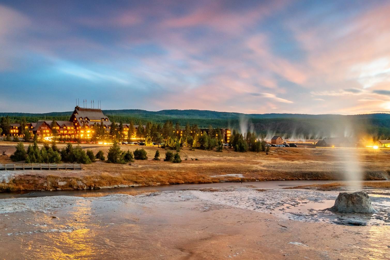 Nestled among towering pines and gushing geysers lies Yellowstone National Park’s most distinctive lodging, a 123-year-old hotel that marries human ingenuity with the raw beauty of nature. Old Faithful Inn is one of the world’s largest log structures in the country’s first national park. And venturing inside the seven-story lobby feels like stepping directly into the vision of architect Robert Reamer.